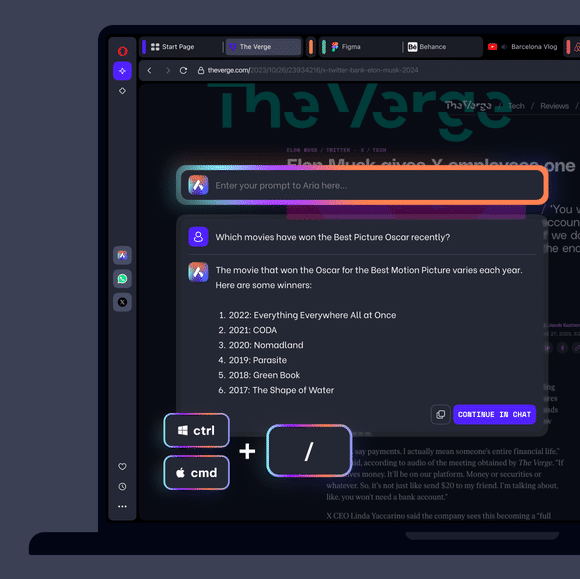 - Command line access: Summon Aria instantly using Ctrl / or Cmd /, with Tab key shortcuts to switch between modes like writing, tab control, and page context.