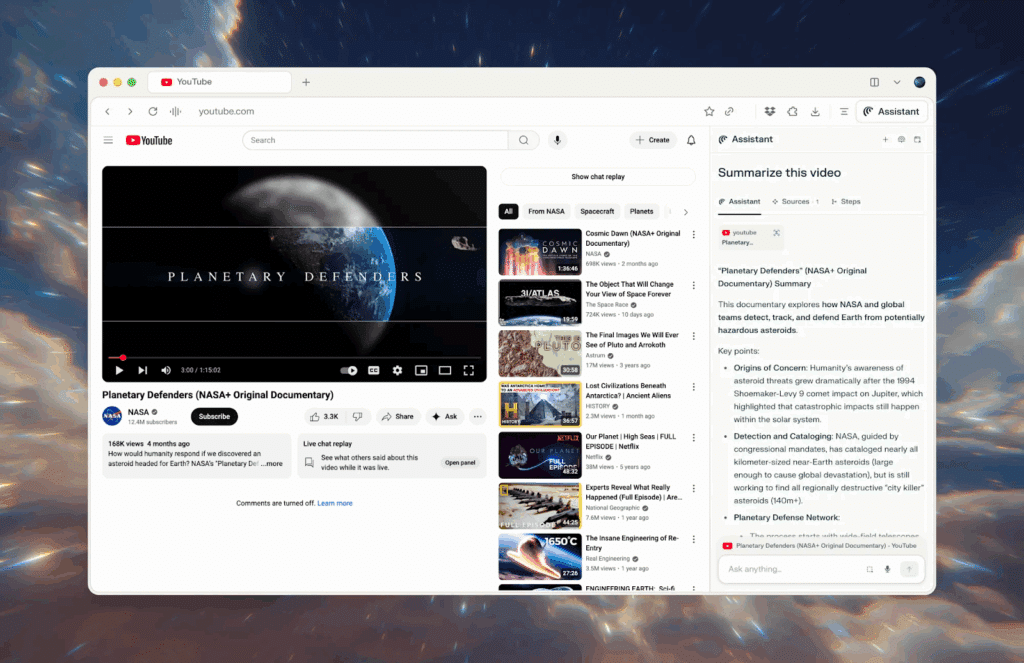 - Conversational agent integration: Provides an AI assistant built into the browser for follow-up questions, research assistance, or interface control via chat.